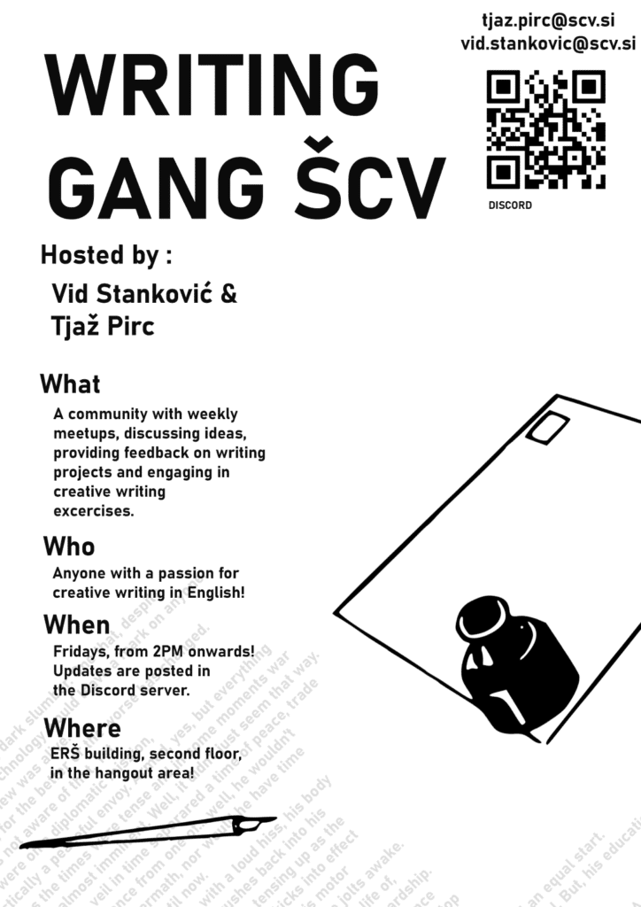 Sva Vid Stanković iz 4. TM in Tjaž Pirc iz 4. TRA. Vabiva vas v skupino kreativnega pisanja v angleščini, kjer bomo razvijali ideje in lastne zgodbe. Začeli bomo ustvarjati originalen svet z originalnimi liki, le-tega pa bomo sčasoma spremenili v novelo in povezane kratke zgodbe.